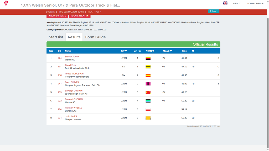 Competing in the 400m at the Welsh Track Championships in Cardiff on 28/6/25 with an excellent 2nd place finish, Greg Kelly has broke the clubs 400m record again which he set just over a week ago.